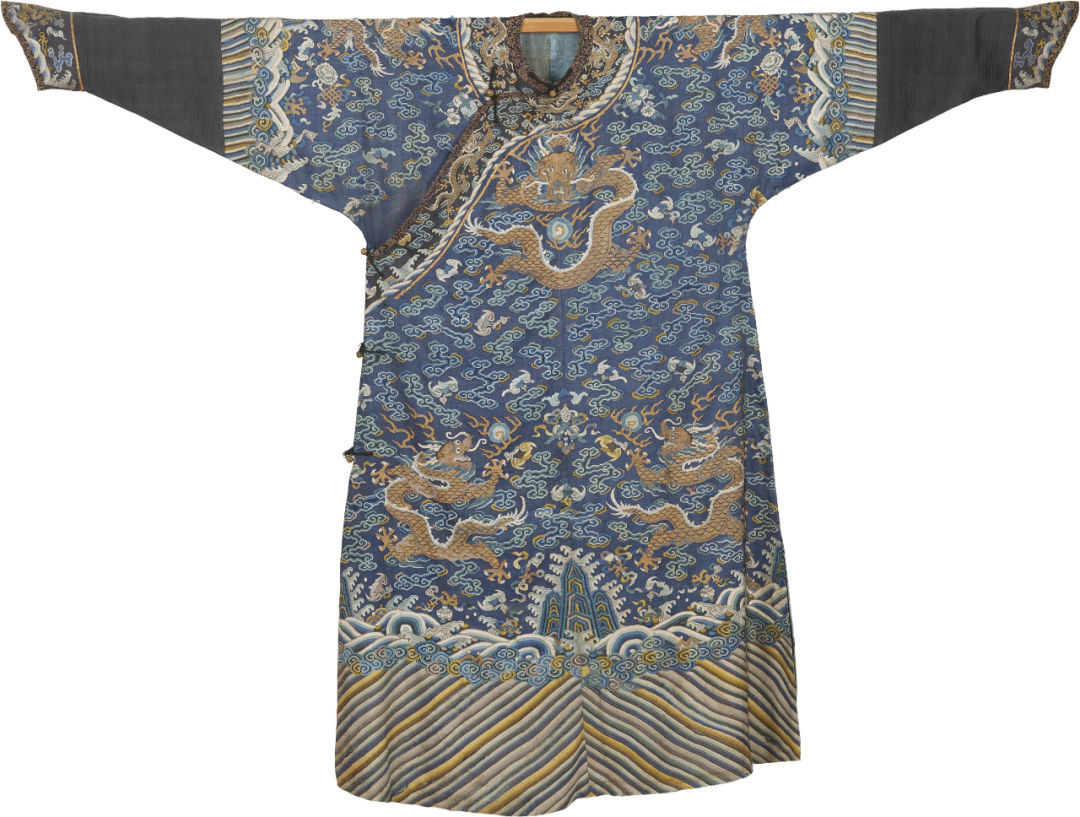 The blue silk brocade robe of Manchu nationality in Qing Dynasty collected by the National Costume Museum of Beijing Institute of Fashion Technology is woven with eight pieces of golden dragons, with auspicious patterns such as ruyiyun, bat, longevity peach and eight auspicious patterns. The weaving process is exquisite and the patterns are vivid. The hem of the dragon robe is decorated with precious stones, which stand on the rolling water waves, meaning that the mountains and rivers will be forever solid and peaceful throughout the world.