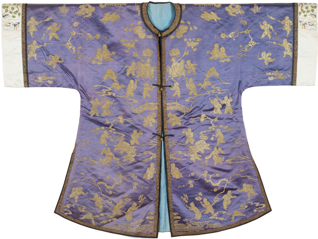 In the collection of the Qing Dynasty, the purple silk clothes with the pattern of dark flowers were woven on the purple silk material, and the black satin edge inlaid with the skirt and the white sleeves on the cuffs were embroidered with the word of three blue. "Xi" is an auspicious character formed by the combination of two separate words "Xi", which means "happiness is added to happiness". This garment, in terms of fabric material, pattern theme, embroidery technology and decorative style, reflects the exchange and integration of Han nationality in clothing culture at this time, which also directly affected the etiquette fashion and aesthetic orientation of folk women wearing clothes at that time.