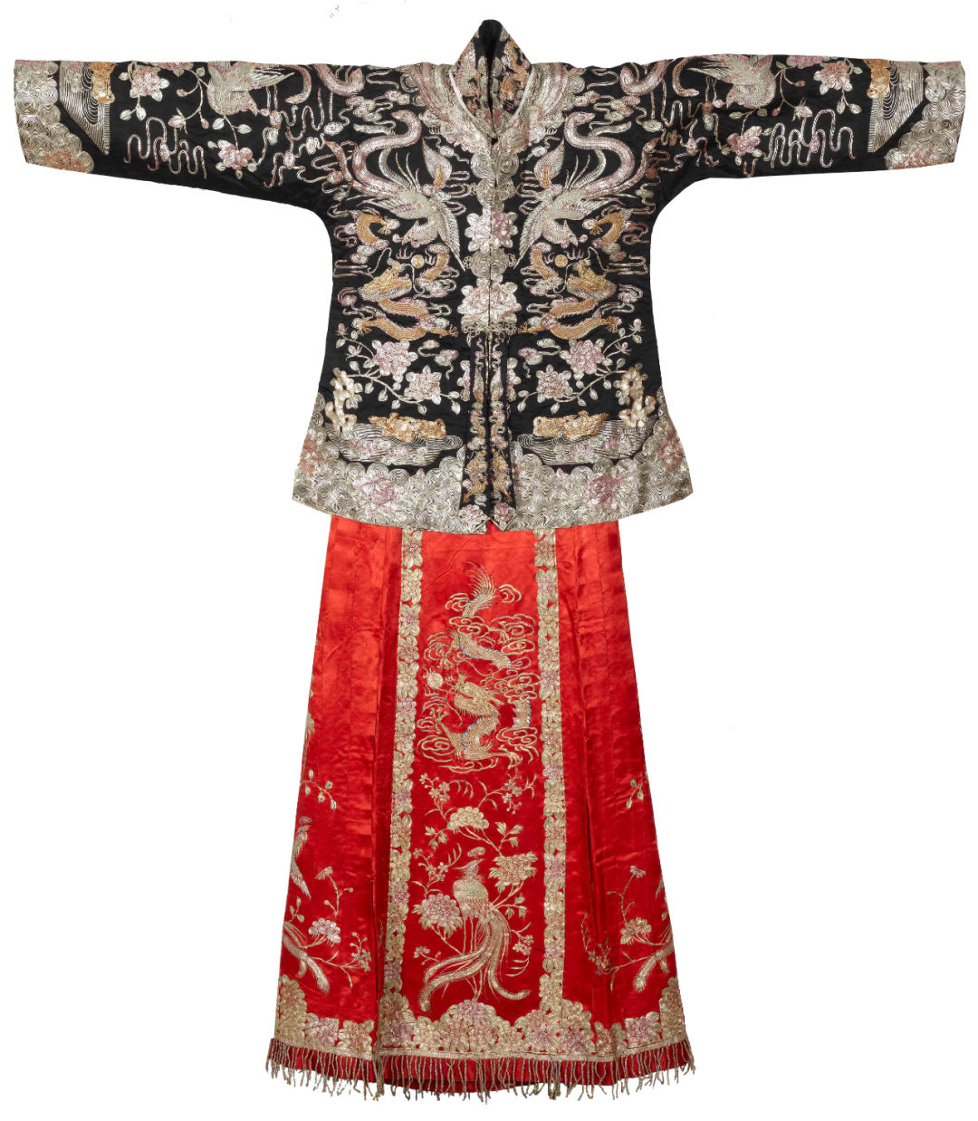 In contrast to the majestic and solemn images in Manchu robes, the dragon and phoenix patterns on the wedding dresses of Han women with flat gold, silver and dragon patterns from the Qing Dynasty to the Republic of China show a festive and peaceful scene. On the wedding dress, it is a woman’s gown embroidered with dragon and phoenix patterns in blue satin and gold and silver, and a horse-face skirt embroidered with dragon and phoenix patterns in red satin and Ping Jin is assembled below. The left and right dresses are embroidered with auspicious patterns such as dragon, phoenix, mandarin duck, peony, lotus and Xiangyun, which are symmetrically distributed around the front of the door, forming a composition style of "dragon to phoenix", which is gorgeous and rich.