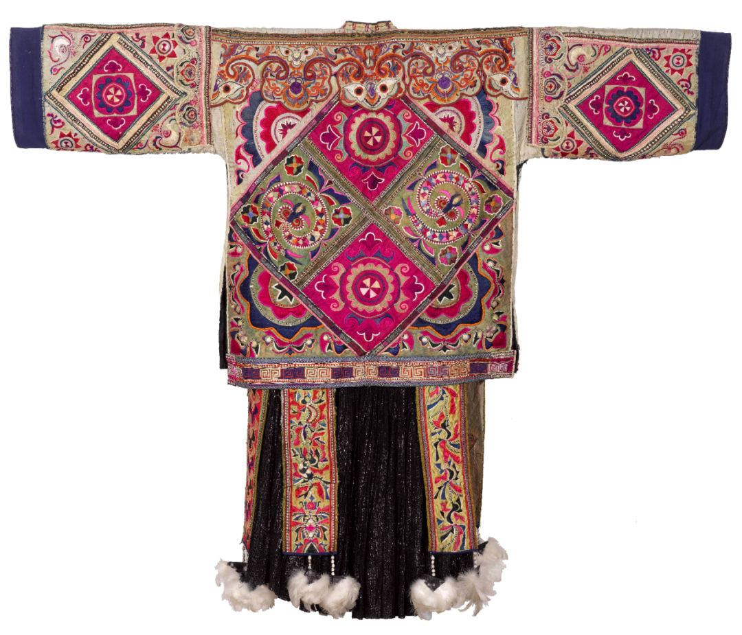 The collection of Guizhou Pingyang-style birds’ clothing is a costume worn by the local Miao people during the drum festival. The fabric of the clothing is silk, with silkworm brocade as the base material in the middle of the back, Ping Xiu dragons, birds, phoenixes, fish, butterflies, flowers and other patterns on it, and the ribbon skirt is decorated with white bird feathers and pearl ornaments of Coix seed, which has a strong sense of ceremony and obvious decorative effect.