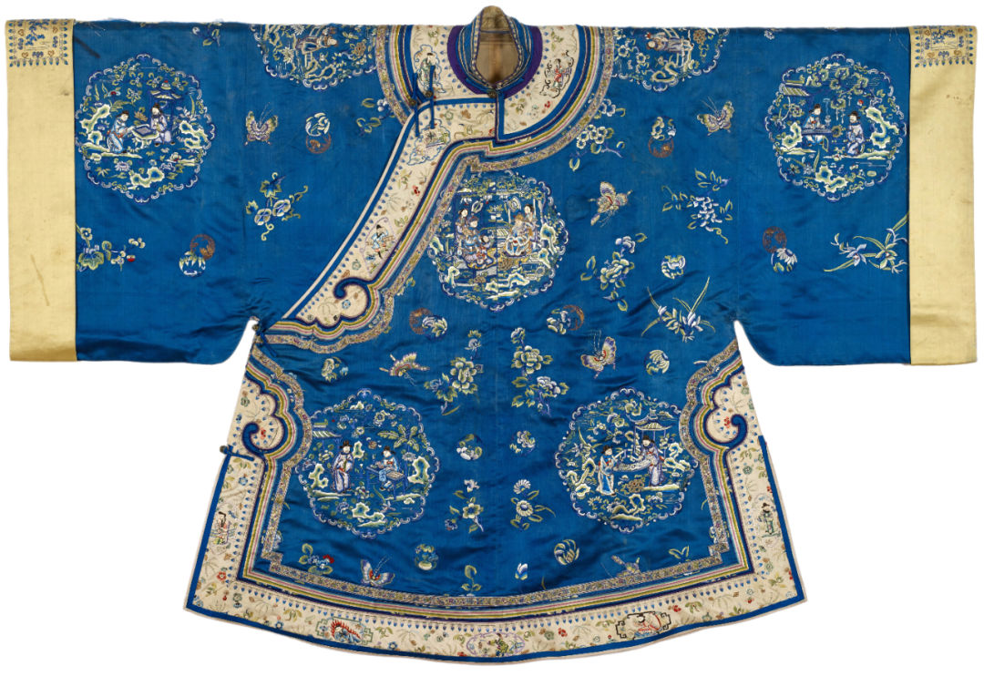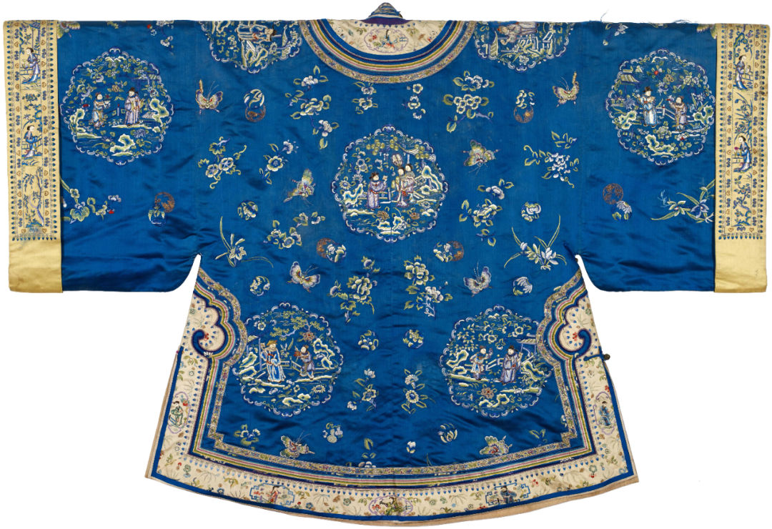 The collection of Han people’s blue satin multicolored embroidered twelve groups of women’s jackets with wide sleeves is based on the theme of Guo Ziyi, a figure in the Tang Dynasty, and the twelve groups of figures are colored embroidered: the middle of the dress is embroidered with a pattern of Guo Ziyi’s birthday; Embroidered characters on the front sleeve and the bottom show the elegant character of ancient literati through the scene combination of characters touching the piano, playing chess, writing and enjoying paintings. There is an embroidered pattern on the back of the dress to celebrate the birthday of the couple, which shows the scene of Guo Ziyi’s son and daughter-in-law celebrating their birthday hand in hand. There are six embroidery patterns on the shoulders, back sleeves and bottom of the clothes. The figures in the patterns extend the meanings of "three levels of promotion", "high position in the position of Lu", "evergreen", "opening an hundred sons", "good luck in the year" and "sending seals for promotion" through different birthday gifts, and express their feelings.