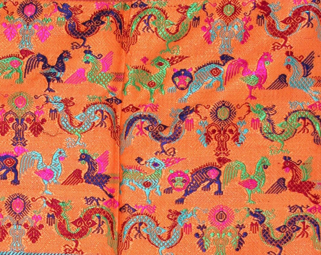 The brocade of dragon, phoenix, lion and deer pattern of Zhuang nationality in Guangxi is woven with auspicious birds and beasts such as dragon, phoenix, chicken, lion and deer, and the pattern colors of blue, green, red, purple and pink are particularly eye-catching on the orange background. Zhuang people often use flowers instead of pearls for dragon patterns, and the combination of dragon and phoenix and flower tree patterns highlights the exchange and blending of strong and strong folk cultures.