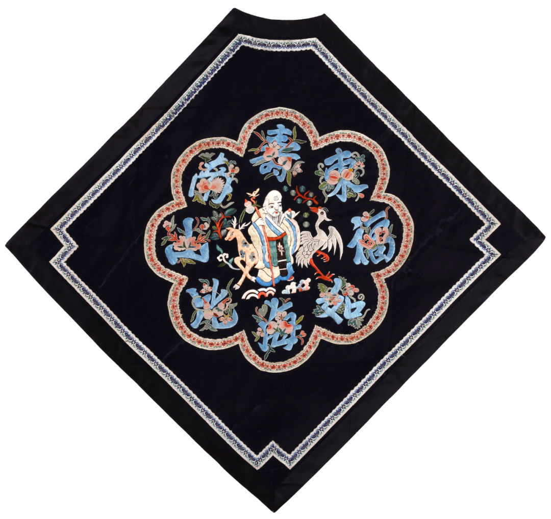 The collection of Qing Dynasty Han people’s azurite satin embroidered "Fu Ru Dong Hai Shou Bi Nan Shan" pattern belly pocket, the fabric is made of azurite pigment satin, and the center is embroidered with mythical figures and beasts symbolizing longevity, such as Antarctic Xianweng, deer and crane. Around Ping Xiu, the eight Chinese characters "Fu Ru Dong Hai Shou Bi Nan Shan" are embroidered with pomegranate, grapes, preserved melons, bergamot, gourds and peaches, which means many children and many blessings.